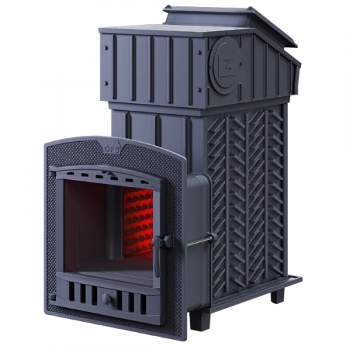 GFS-ЗК - печь с усиленной каменкой большей массы, с единым углублением внутрь топки для дополнительной укладки чугунного заряда. Теплосъемные шипы, со стороны горения пламени, в разы увеличивают площадь соприкосновения огня с каменкой и ускоряют передачу тепла, а также способствуют лучшему дожигу смешивая потоки пламени и воздуха поступаемого из воздушника. Эти усовершенствования значительно повышают мощность парообразования печи и выдают большее количество пара при непрерывной подаче воды. Каменка печей GFS-ЗК является незаливаемой.