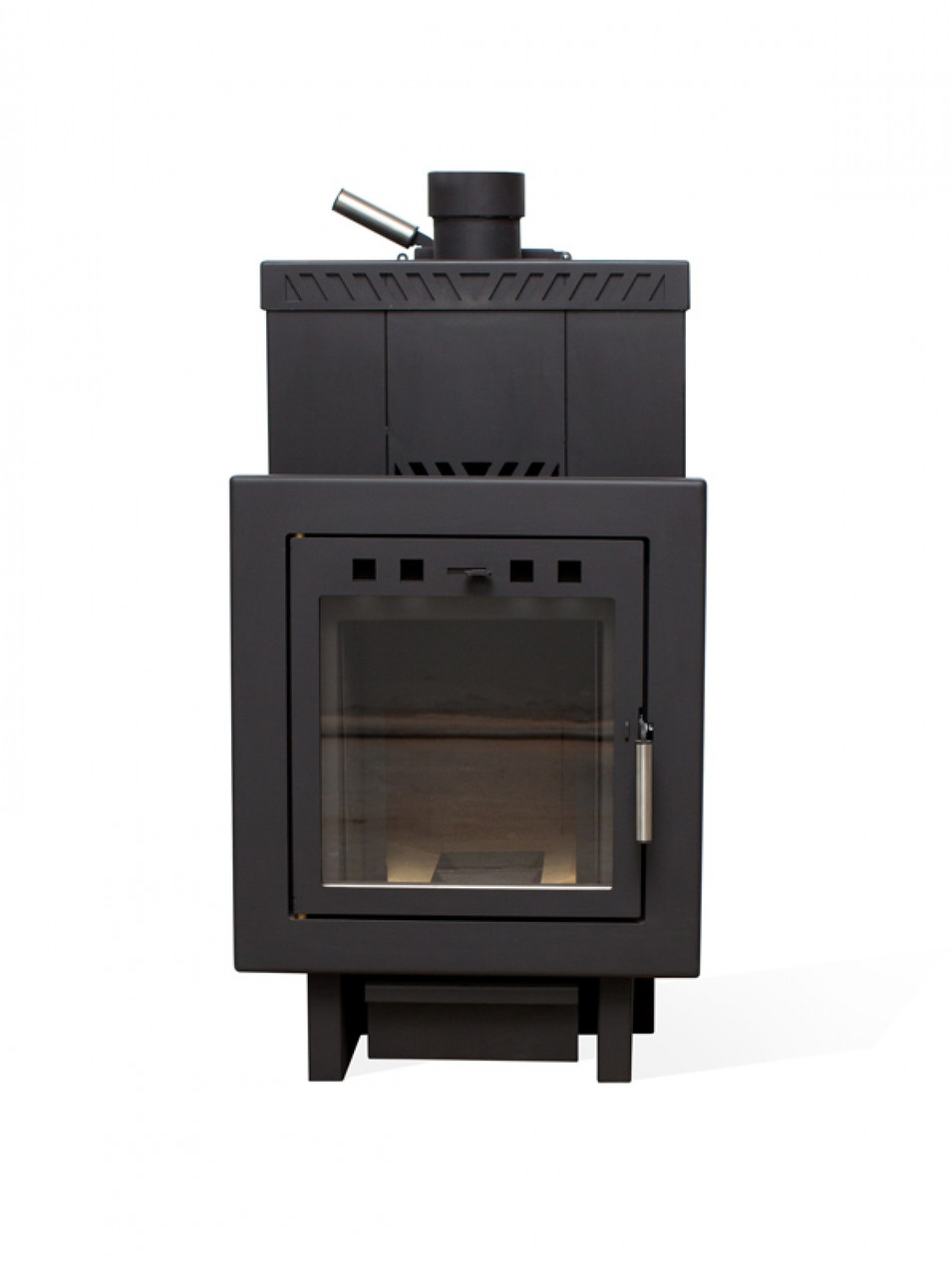 - Печь обладает регулируемой выносной топкой (от 200-та до 300-та мм), что позволяет топить ее со смежного помещения. При этом печь способна и отопить смежное помещение от 25 до 50 м2 (топочная, предбанник, комната отдыха).